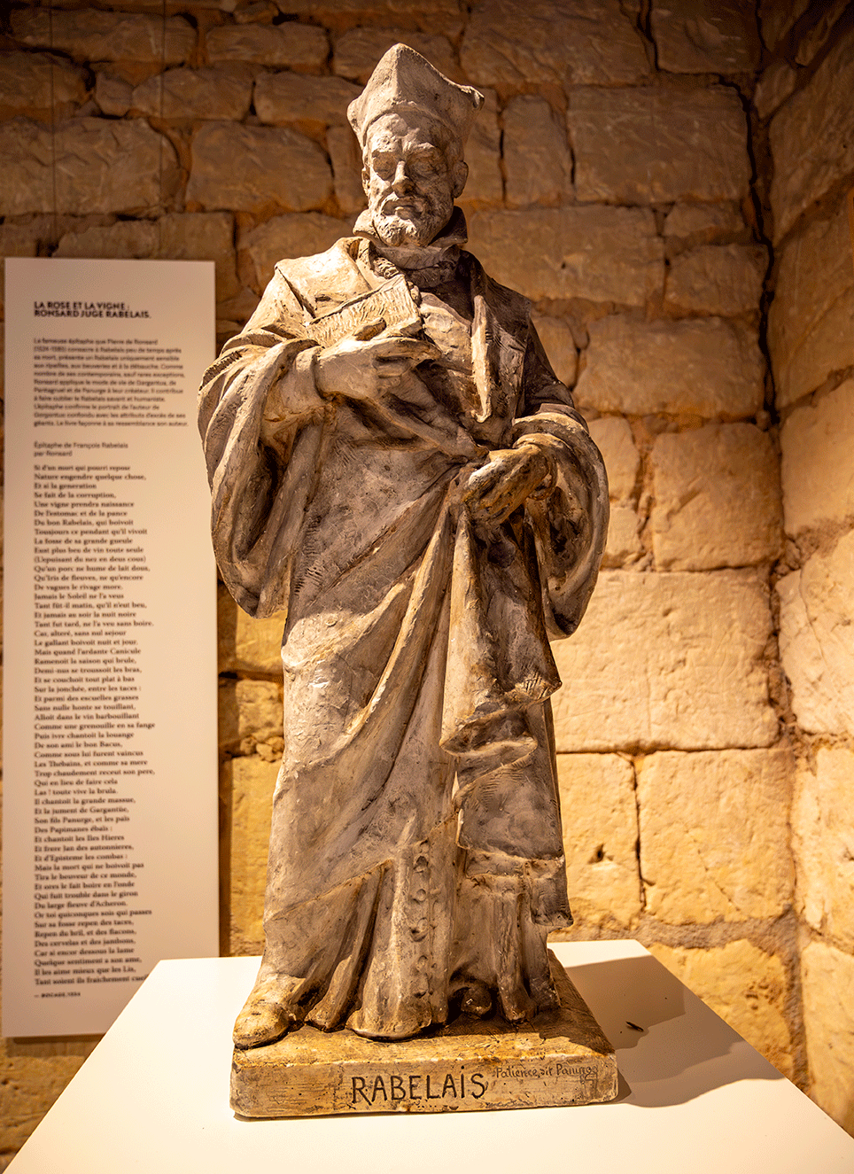 « C’était un homme qui voyageait beaucoup, qui devait aussi bouger pour se sauver. C’était un intranquille, il vivait dans la crainte de la condamnation des théologiens de la Sorbonne. » Obligé de fuir, d’être exfiltré comme on dit de nos jours, Rabelais a cependant bénéficié de l’appui de personnages haut placés, éveillés aux idées nouvelles, qui ont été ses protecteurs : Geoffroy d’Estissac, prélat de l’abbaye de Maillezais, et surtout Jean du Bellay, évêque de Paris, cardinal, et membre éminent de la Cour, dont le portrait figure en bonne place dans une des pièces du musée. Celui de Rabelais aussi, bien sûr. Ou ceux de Rabelais plutôt, car le bougre, peint par nombre d’artistes de son époque (ou plus récemment), ne présente jamais exactement le même visage. Mais cela est-il étonnant, de la part de cet homme qui fut, hormis l’écrivain que nous connaissons, médecin (défenseur de la gélothérapie, la médecine par le rire), moine puis curé, ou encore éditeur ?