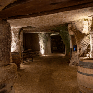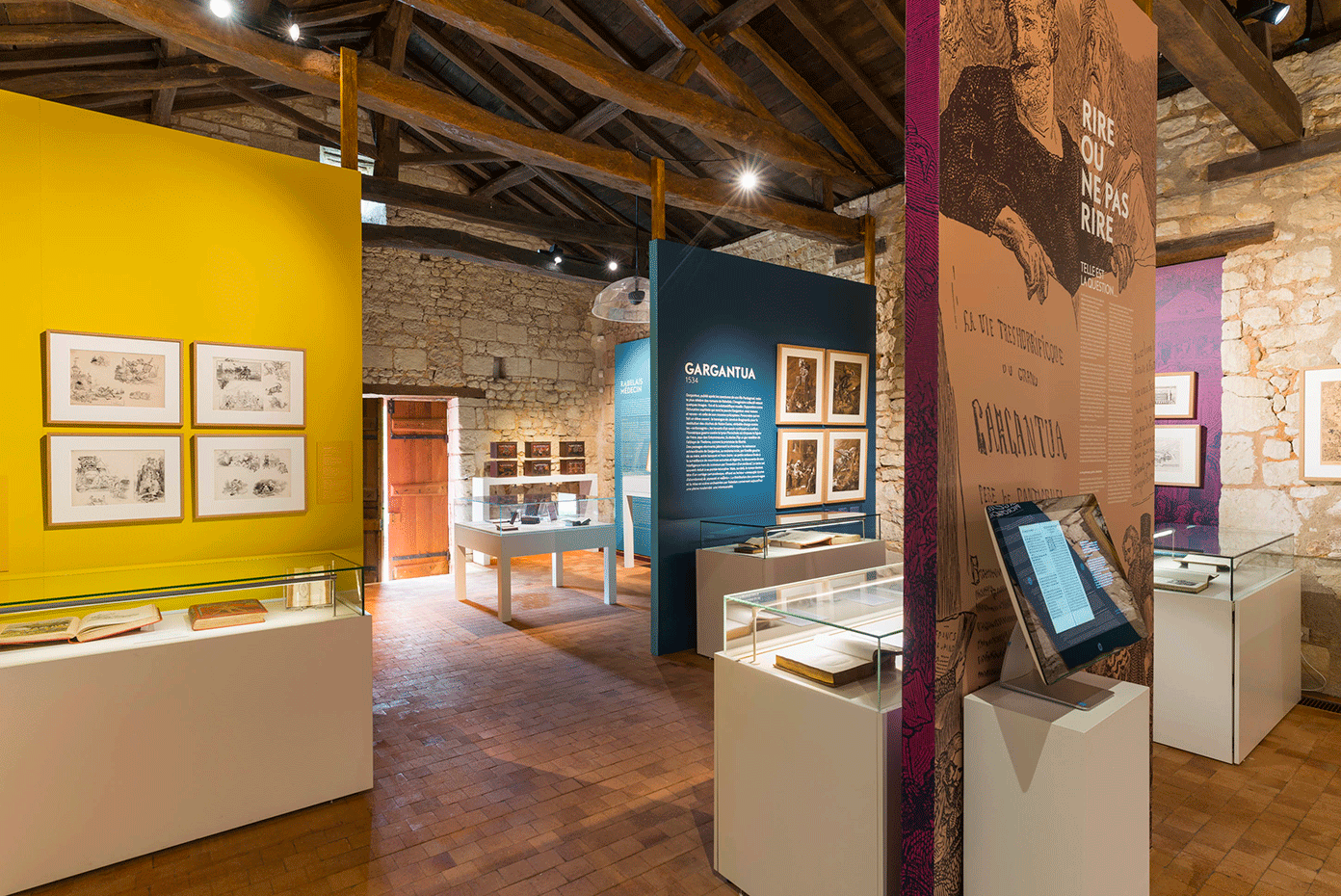 La pièce accueille aujourd’hui des collections graphiques, des éditions rares, mais aussi le portrait de Rabelais au fusain réalisé par Matisse. À l’étage se trouvent les chambres, dont celle, telle qu’elle fut peut-être, de Rabelais, avec sa grande cheminée. Accolé au logis, le pigeonnier-grange, avec son toit en tuiles courbes et ses façades percées de 288 boulins – signes de richesse – abrite désormais un parcours scénographique évoquant l’auteur, sa vie, ses écrits. Sous terre aussi, il se passe des choses ! 600 m2 de caves et de galeries ont été réhabilités pour les visites. On mesure l’importance de l’activité viticole autrefois ; aujourd’hui, des expositions occupent ces vastes espaces…