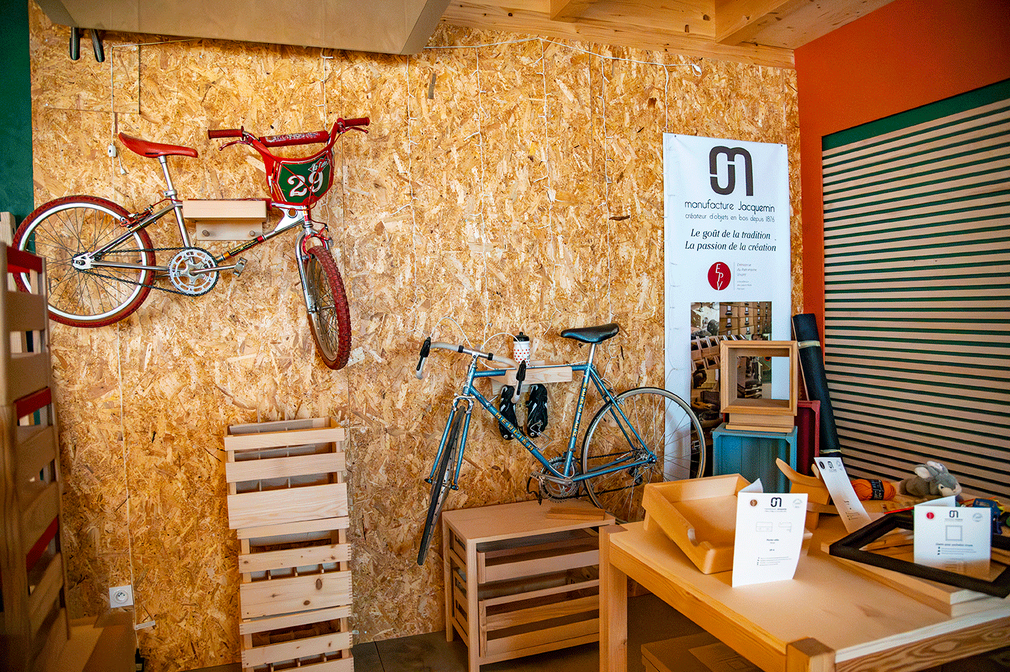 « Le local, c’est dans l’ADN de Dominique. » raconte Lise. « On veut travailler de beaux objets, de beaux bois, dans le respect de la nature en valorisant ce qu’elle a à nous offrir. On ne travaille que des bois locaux et on oriente les clients sur des finitions naturelles, tant pour eux que pour nos salariés. On privilégie les finitions à base d’eau ou d’huile plutôt que des produits polyuréthanes par exemple. On se fournit dans des scieries à 15 km maximum de l’entreprise. Les clients sont très sensibles à cette démarche. Ils sont aussi très exigeants dans le choix du bois, que nous sélectionnons avec rigueur, ce qui peut parfois générer des chutes. Pour valoriser au mieux notre matière première, on réutilise les plus beaux morceaux pour notre gamme d’objets. Toutes les parties qui ne sont pas réutilisables nous servent à alimenter notre chaudière en hiver. » Là encore, la manufacture Jacquemin va miser sur l’originalité et la qualité. Parmi ses produits phares, des objets insolites, comme des porte-bouteilles personnalisables, des cadres pour vinyles, des porte-vélos ou encore des tire-bottes.
