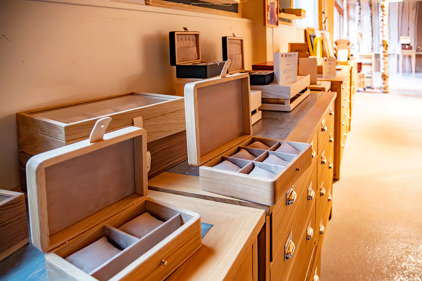 « Pour notre marque, on n’a pas de limite dans l’innovation, mais on a décidé de fabriquer uniquement des produits utiles, qu’on peut utiliser au quotidien, en privilégiant les univers de la décoration, de la cuisine et du rangement. On propose par exemple des planches à découper, des corbeilles de fruits, des caves à fromages, des boîtes à bijoux ou à thés, des organiseurs ou encore du petit mobilier, comme des tabourets. Mais notre best-seller reste le coffret à montre. » De l’artisanat local « dans l’air du temps » disponibles en plusieurs essences de bois certifiés PEFC (noyers, français et américain, chêne, hêtre, frêne, érable, merisier, tilleul…) et proposés à des tarifs attractifs. « Pour notre marque propre, On privilégie la vente en direct plutôt que de passer par des revendeurs car on veut proposer des tarifs au plus juste. La tabletterie aujourd’hui, c’est un beau plateau en chêne massif, Made in Jura, de qualité, avec des arêtes cassées, de belles finitions et qu’on peut s’offrir pour chez soi, à un prix raisonnable. »
