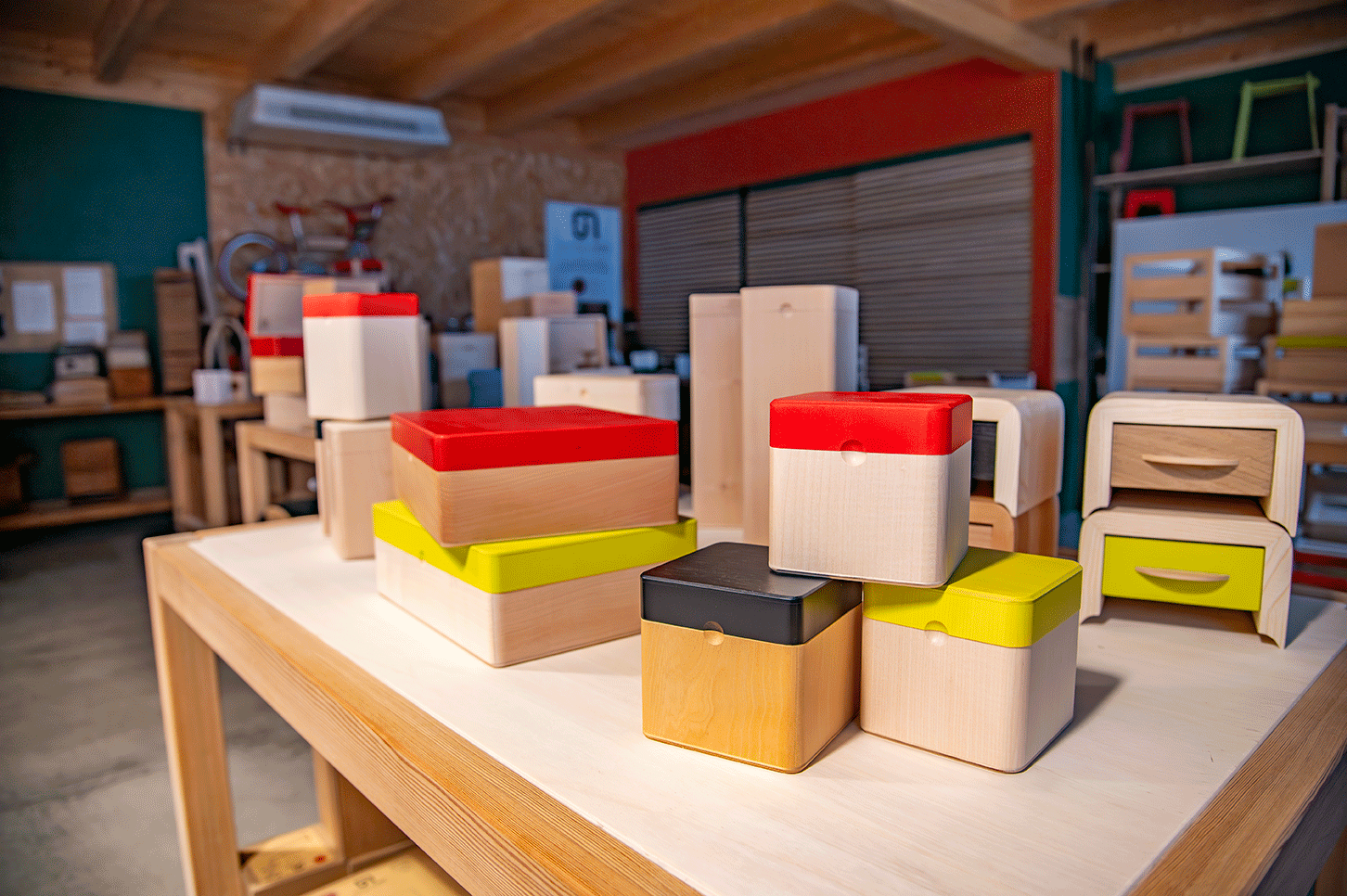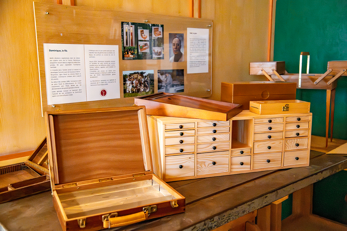 « Au début du siècle suivant, le grand-père de Dominique, Victor, va reprendre l’entreprise et se spécialiser dans les coffrets à couture, les boîtes à fiches et les travailleuses. Il a fait le choix de s’éloigner des productions traditionnelles locales pour se tourner vers quelque chose de plus moderne. » Intégrés au catalogue Manufrance, ces nouveaux produits jugés novateurs intéressent bien vite les grands magasins parisiens. Pour se fournir en matières premières et faciliter le transport de ses marchandises, Victor délocalise l’entreprise à Chamblay en 1956, près de la scierie qui fournit encore aujourd’hui la majorité des essences nécessaires à la production. Dans les années 60, le père de Dominique, Noël, opère un nouveau tournant : les usages évoluent, le bois attire moins et de nouveaux matériaux font leur apparition. Noël travaille alors comme sous-traitant pour de grandes marques comme Mobalpa, Pebéo et Terraillon et produit des habillages de pèse-personnes, des casiers à couverts et des boîtes de toutes sortes, pour la peinture par exemple.