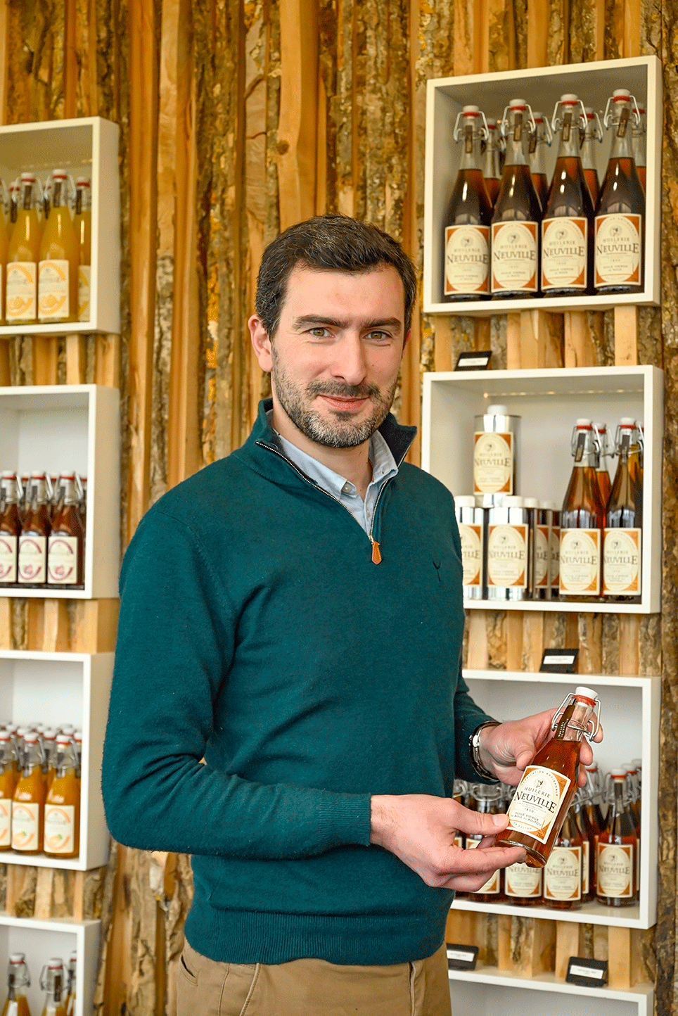 Nouveau site, nouvelle usine, nouveau nom, nouvelle identité visuelle… et nouveaux produits. « Auparavant, le produit principal était l’huile fruitée, rappelle Philippe Chatellier, 38 ans, tout récent patron de l’entreprise qu’il a rachetée en novembre dernier. C’est de l’huile de colza raffinée fruitée avec des tourteaux de noix (ce qui reste quand les fruits ont été pressés). Nous continuons de la faire, c’est ce que nous vendons le plus – 30 000 litres par an –, mais le groupe À L’Olivier avait orienté la production vers les huiles vierges, de noix, noisette, sésame, colza (du Poitou), amande, pistache et cacahuète. Il a ajouté à la gamme les vinaigres aromatisés, poivron, framboise, mangue, citron, etc., mais aussi des moutardes et des sels aromatisés. » Philippe Chatellier suit le même chemin, tout en cherchant avec son équipe de nouvelles saveurs, un vinaigre à la myrtille devant arriver sous peu. Nous nous concentrerons toutefois sur les huiles, produits-phares, emblématiques, surtout celle de noix (lire l’encadré), en production le jour de notre venue.