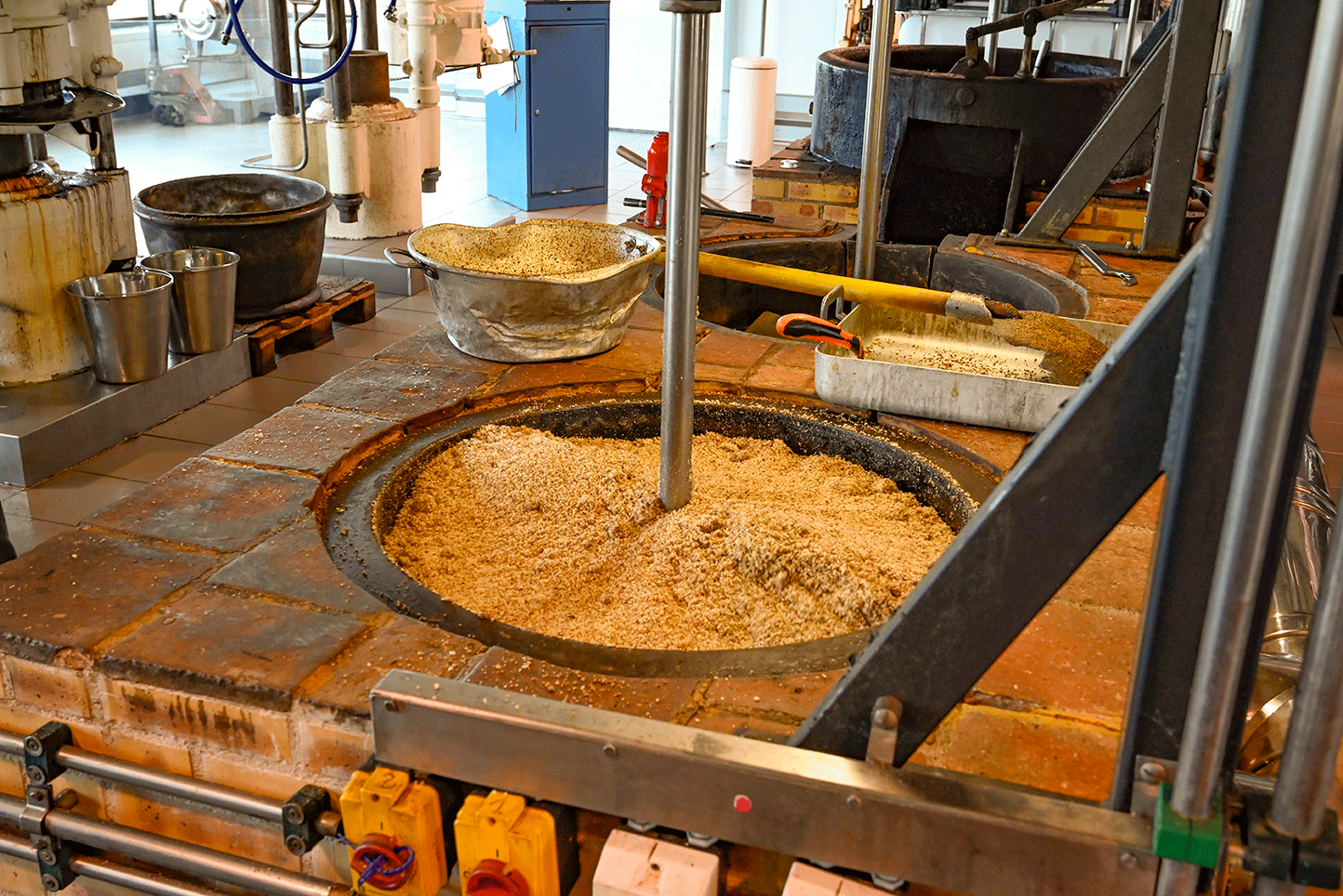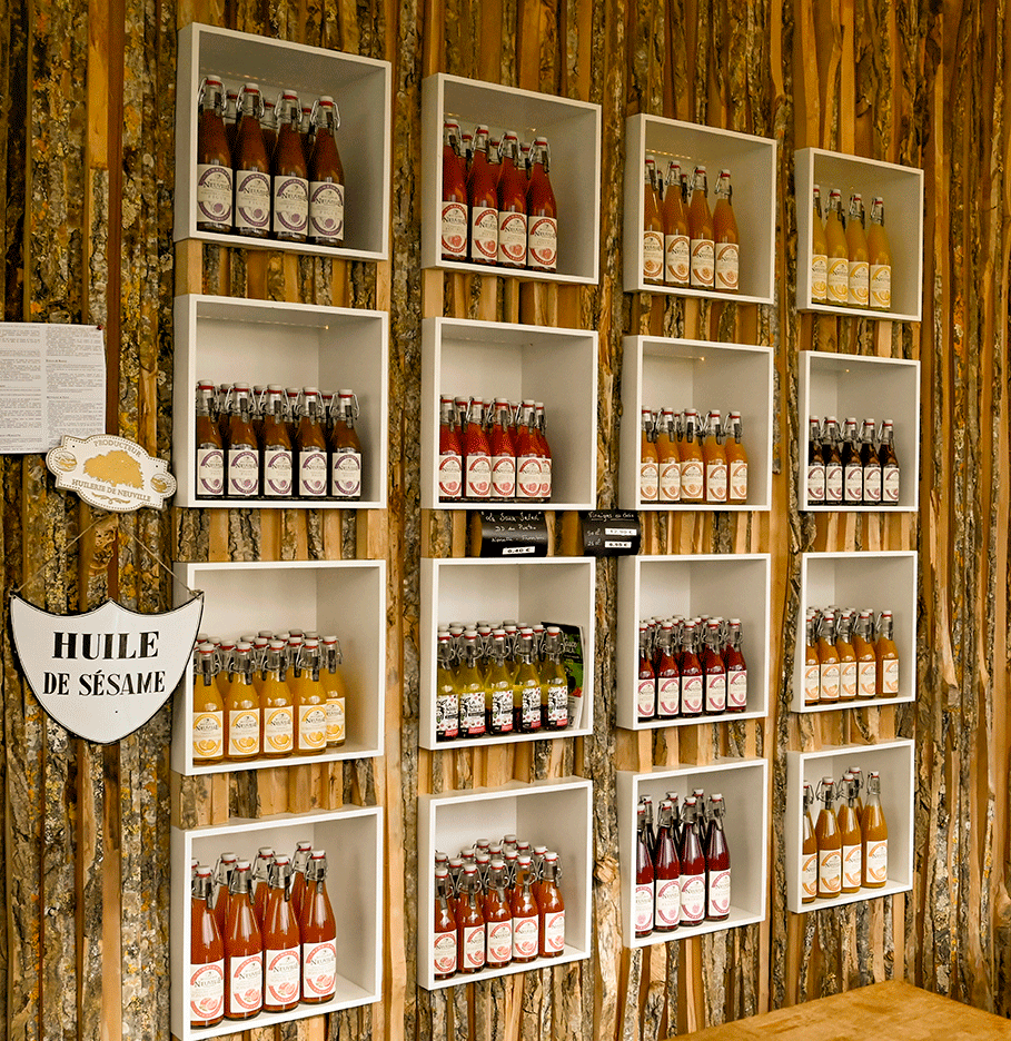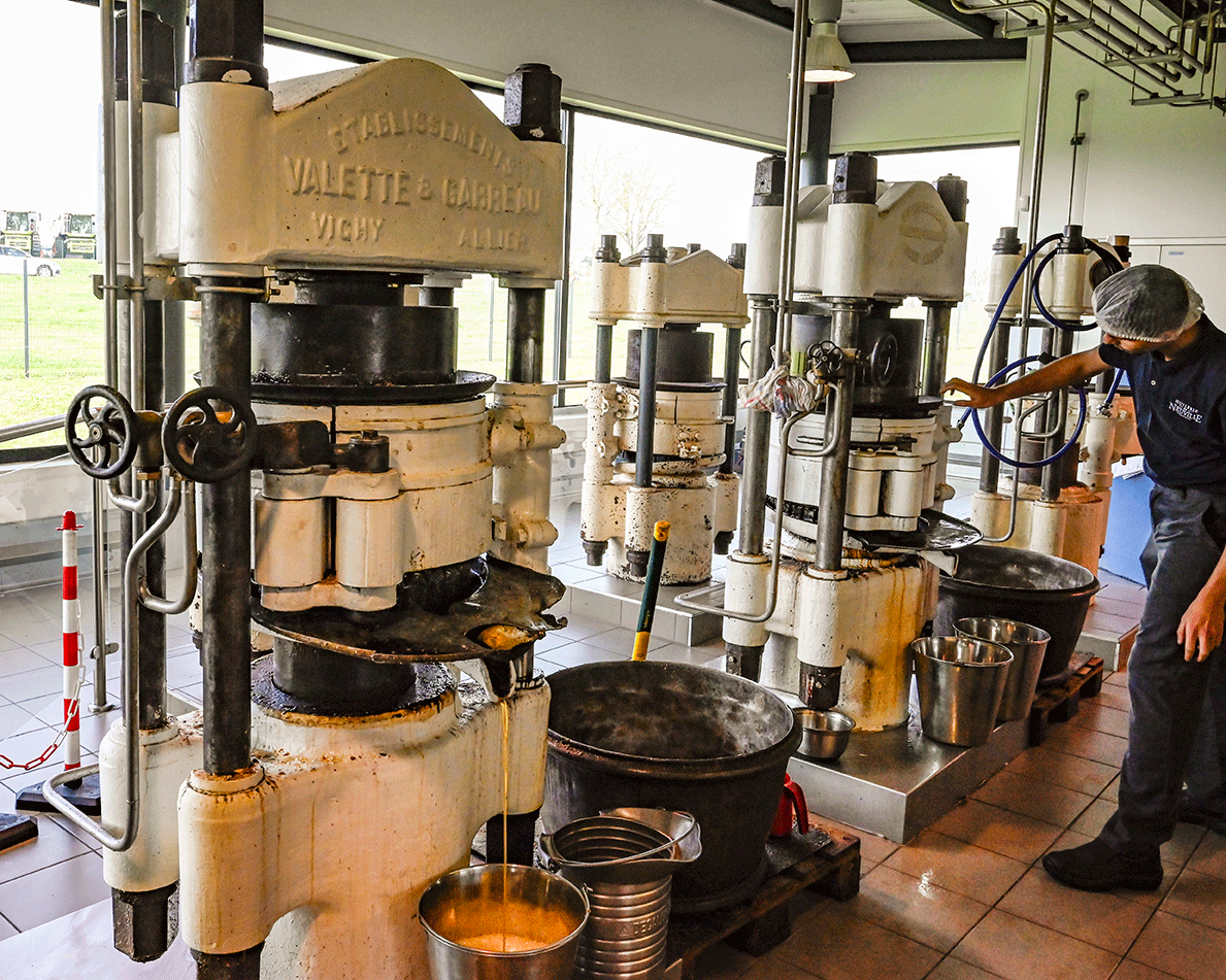 Des meules en pierre sont là pour rappeler l’ancrage de l’entreprise dans l’histoire et le patrimoine, mais elles ne servent plus : les noix passent dans un broyeur mécanique, en sortent à l’état de poudre, laquelle est toastée dans un poêlon en fonte pendant une trentaine de minutes à 80 °C. Les noix sont ensuite pressées à chaud – un choix de l’entreprise, d’autres pressent à froid –, pour le goût et une meilleure conservation (24 mois sans craindre la lumière). La presse hydraulique, vintage pour le coup – elle date du début du XXe siècle –, est en action, exerçant une pression de deux tonnes sur nos noix ! Et l’huile vierge coule… Récupérée, elle est stockée six semaines dans des futs en inox, où une décantation naturelle, choix là encore de l’entreprise, s’opère. L’huile pure est alors conditionnée. Rien de caché, la production est on ne peut plus transparente. Aussi transparente que l’huile vierge de Neuville est translucide !