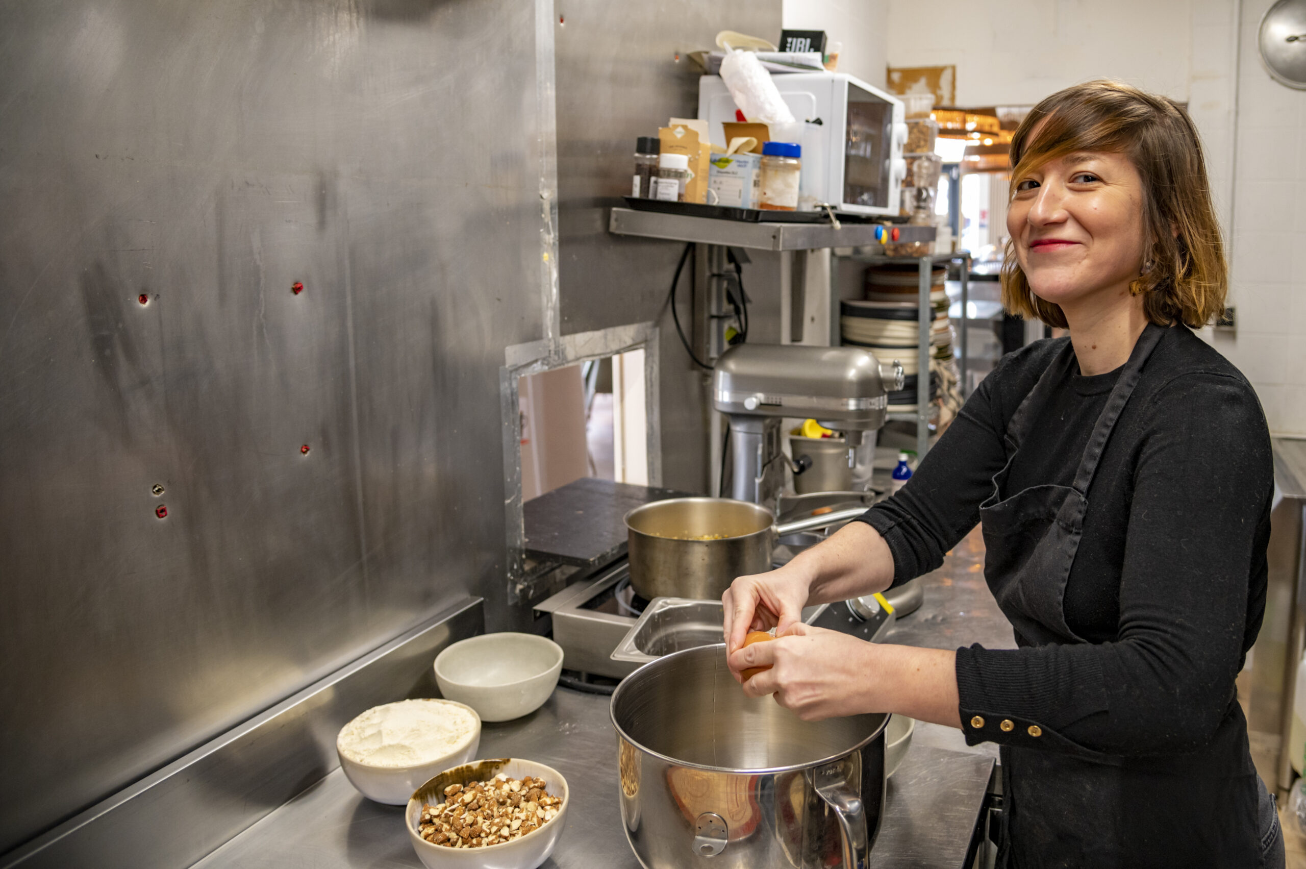 5- Ajoutez la moitié de la farine, puis 200 g d’amandes et enfin le reste de la farine. Mélangez jusqu’à obtenir une pâte dense un peu collante.